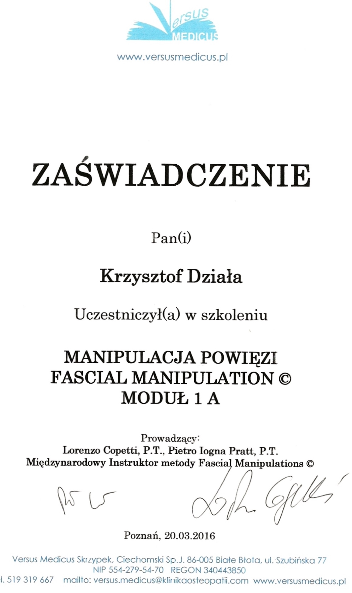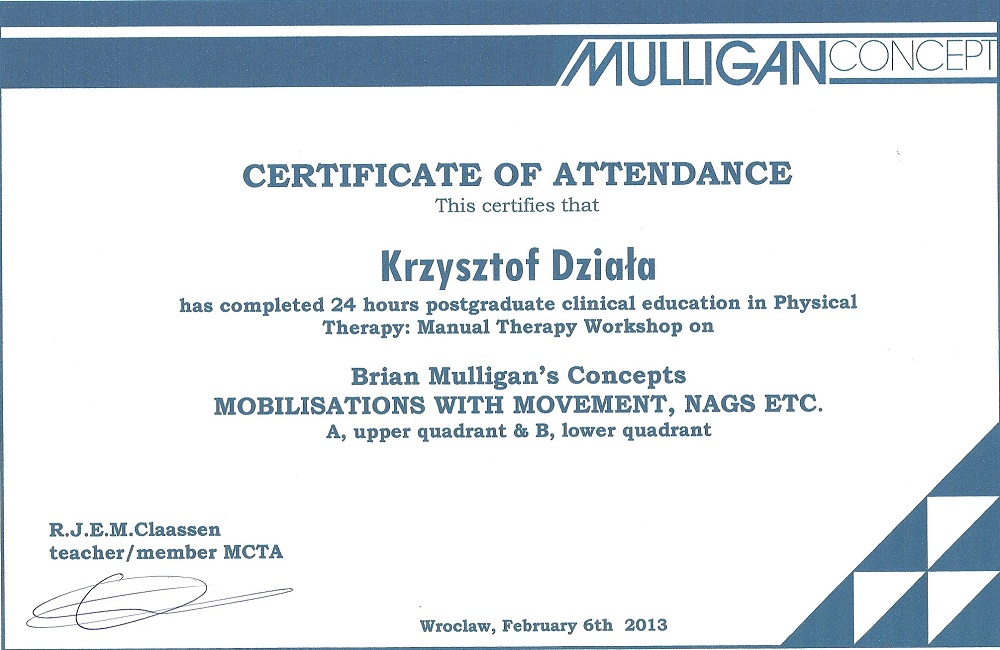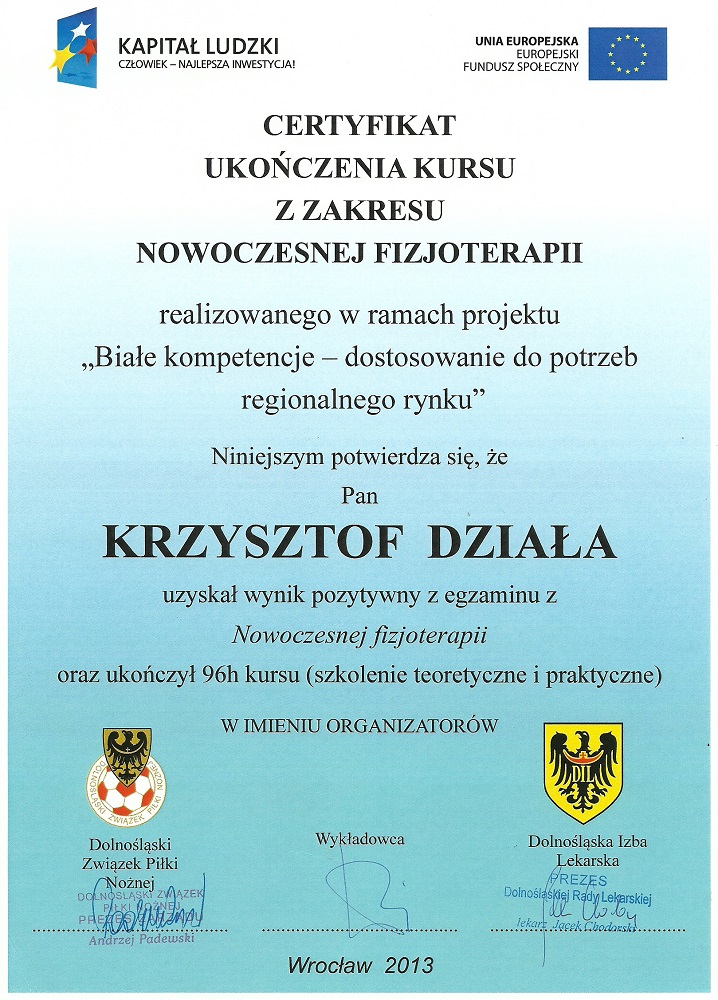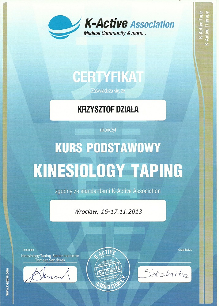 Magister fizjoterapii, absolwent Akademii Wychowania Fizycznego we Wrocławiu, instruktor pływania, student Akademii Osteopatii. Ukończyłem wiele kursów specjalistycznych w tym kurs terapii manualnej wg Mulligana, Kinesiologytaping, kurs współczesne metody diagnozy i leczenia tkanek miękkich, manipulacji powięziowej wg Stecco, terapii punktów spustowych, fibrolizy za pomocą haków i kinezjologii w sporcie. Aktywnie uprawiam sport i jestem zwolennikiem jak najszybszego przywrócenia pacjenta do funkcji oraz przeplatania metod leczniczych elementami treningu funkcjonalnego. Do każdego pacjenta podchodzę indywidualnie i rozpatruję dysfunkcje przez pryzmat całego ciała jako jedności.